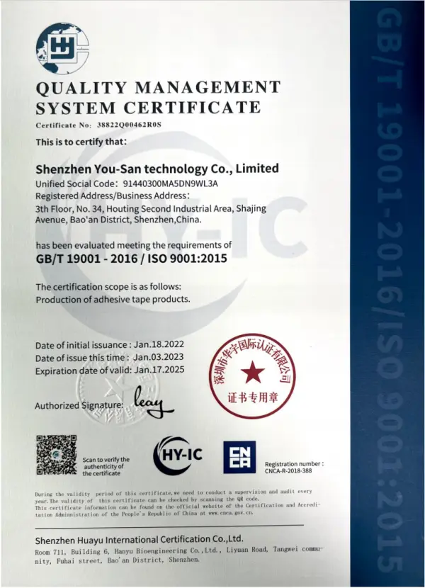Shenzhen Yousan Technology Co., Ltd. was established in 1997. It is an innovative enterprise integrating R&D, production and sales. We have a professional R&D team for adhesives and precision coating technology, covering polymer synthesis, polymer rheology technology, high-performance film research, precision coating and high-precision die-cutting manufacturing, etc., providing customers with full-process adhesive tape application solutions. The company is headquartered in Shenzhen Special Economic Zone, the innovation capital of mainland China, with six major production bases. Today, our products are sold to more than 120 countries in Asia, Europe, America, Africa and Australia.